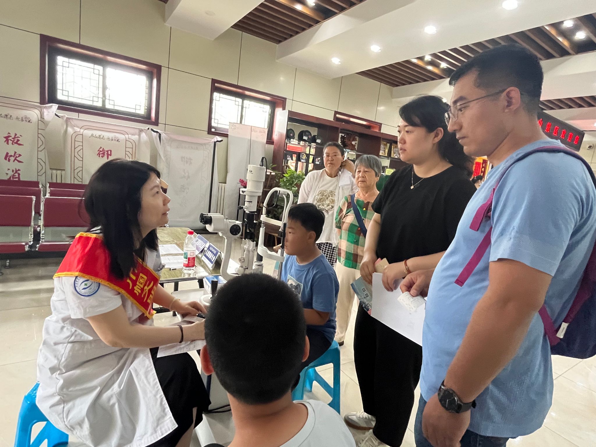 活动现场,党员志愿者们秉持着为人民服务的宗旨,以专业的医疗技术和饱满的热情,为群众开展了视力检查、眼底检查、眼表检查等项目的筛查服务。对于筛查出眼病的居民,志愿者们耐心细致地提供专业的治疗方案,并建议他们前往正规医院接受进一步的检查和治疗,确保每一位居民都能得到及时、有效的医疗指导。此次活动中,中医眼科副主任、副主任医师宿艳充分发挥专业优势,为大家带来了中医眼科核桃灸以及耳穴压豆的特色体验服务。她不仅亲自为群众操作,还详细讲解了耳穴压豆的适应症及功效,根据每个人的身体状况仔细辨证,让群众在体验传统中医魅力的同时,也学到了实用的健康知识。