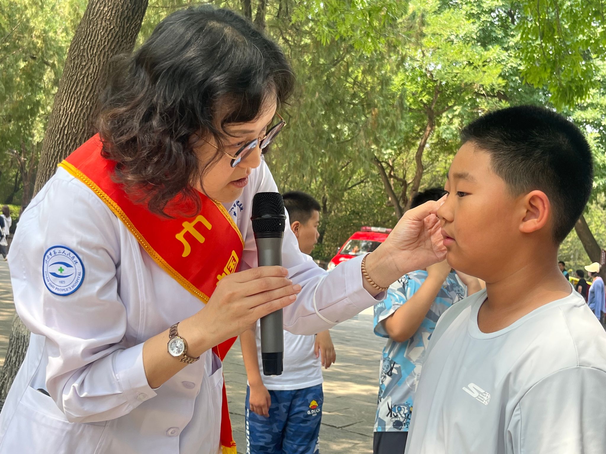 考虑到恰逢六一儿童节,志愿者们特别为公园里的孩子们准备了一份特别的健康礼物。在现场,一场生动有趣的眼保健操科普知识讲座火热开展。志愿者们用通俗易懂的语言和形象的演示,向孩子们传授眼保健操的正确做法和护眼知识,引导孩子们养成良好的用眼习惯。孩子们积极参与互动,现场气氛热烈,讲座受到了大家的一致好评。