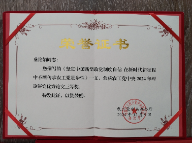 支部主任委员盛艳娟撰写的《坚定中国新型政党制度自信 在新时代新征程中不断传承农工党进步性》一文荣获农工党中央2024年理论研究优秀论文三等奖。此次征文活动中,各省级组织共收到1551篇理论征文,经初审筛选,提交入选论文547篇。经中央研究室组织专家匿名评审和复审,并报中央领导审定,综合评选出理论研究优秀论文奖428篇,其中一等奖66篇、二等奖132篇、三等奖230篇。盛艳娟主任委员在本职工作中精益求精,充分发挥自身专业优势,在参政党理论研究方面取得了丰硕成果,为新时代中国特色社会主义参政党建设贡献了智慧和力量。