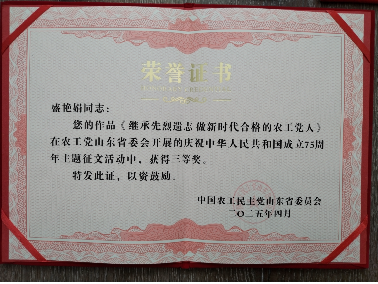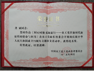 支部主任委员盛艳娟以《继承先烈遗志,做新时代合格的农工党人》为题,农工党党员龚斌以《同心同德 砥砺前行——农工党在新时代新征程的使命与担当》为题参与征文,分别荣获三等奖和优秀奖。深刻展现了农工党云顶赌场app