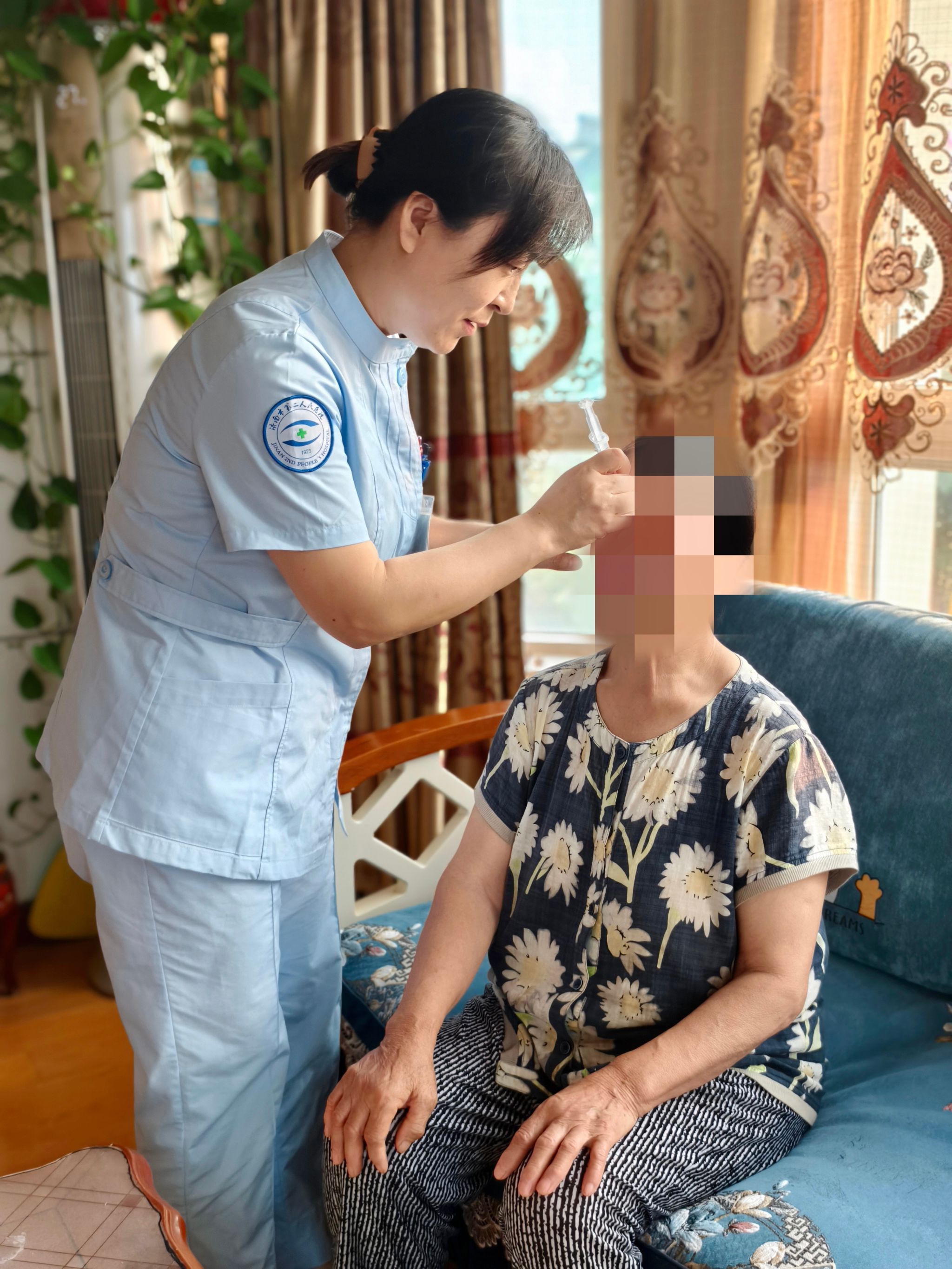 接到订单后,眼七科护士长王娟第一时间拨通梁阿姨的电话。她仔细询问老人右眼恢复情况及左眼流泪的频率与程度,是否伴有分泌物及老人的既往病史等情况,同时调阅了梁阿姨的右眼手术档案仔细比对,全面评估后按照预约时间,携带齐全的无菌冲洗器械、消毒用品,准时来到梁阿姨家中。“阿姨您坐着别动,我先给您检查一下眼部情况。”她轻柔地拨开老人眼睑,仔细查看后视频连线眼七科大夫,经和大夫确认后,怀疑为左眼泪道不通,欲行泪道冲洗。随后她拿出冲洗针,一边轻柔探入一边轻声安抚:“阿姨您放轻松,就像做眼保健操一样,我动作很轻,不会疼的……”整个过程仅用两分钟,她手法熟练又轻柔,顺利完成了泪道冲洗。