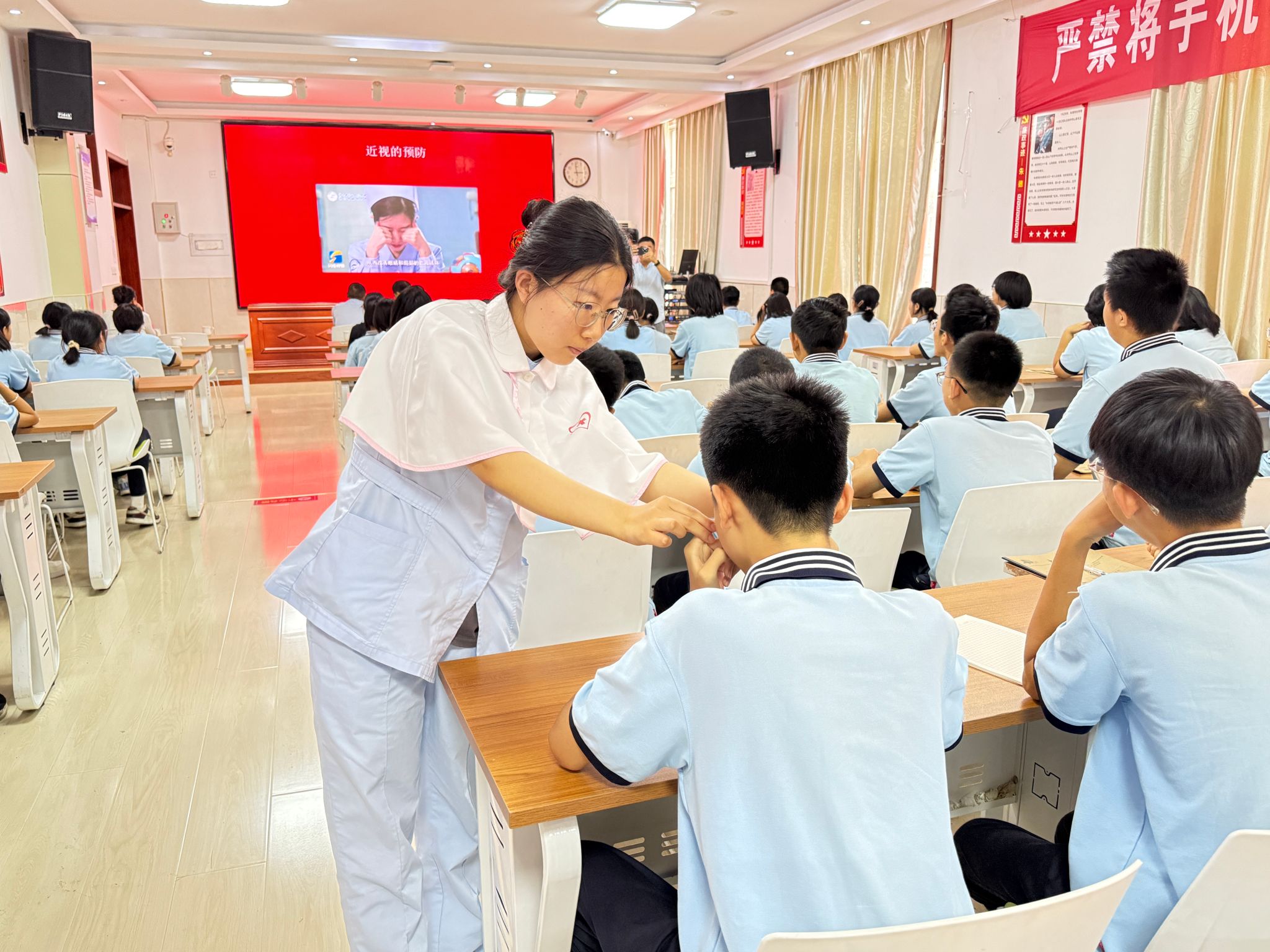 )“护瞳行动”志愿服务队在眼一科(眼外伤、泪器病专业)副主任、主任医师陶远的带领下来到济南市长清区第一初级中学,为同学们带来了一场别开生面的近视防控主题讲座,以此开启了2025年秋季“开学第一讲”的序幕,为新学期学生眼健康保驾护航。