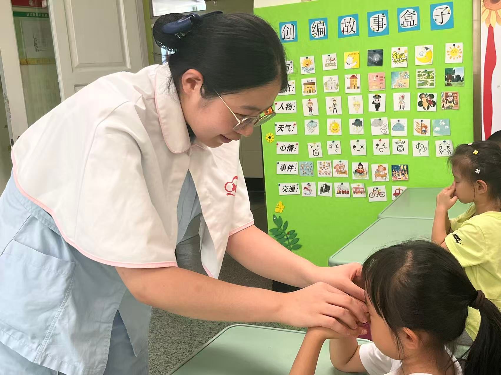 视频播放完毕,护瞳团队的志愿者迅速展开现场“一对一”教学。她们穿梭在学生中间,耐心纠正每个不规范动作,手把手地帮助学生找准穴位,掌握适合的按压力度。在志愿者的悉心指导下,孩子们逐渐掌握了眼保健操的正确方法,动作愈发标准。