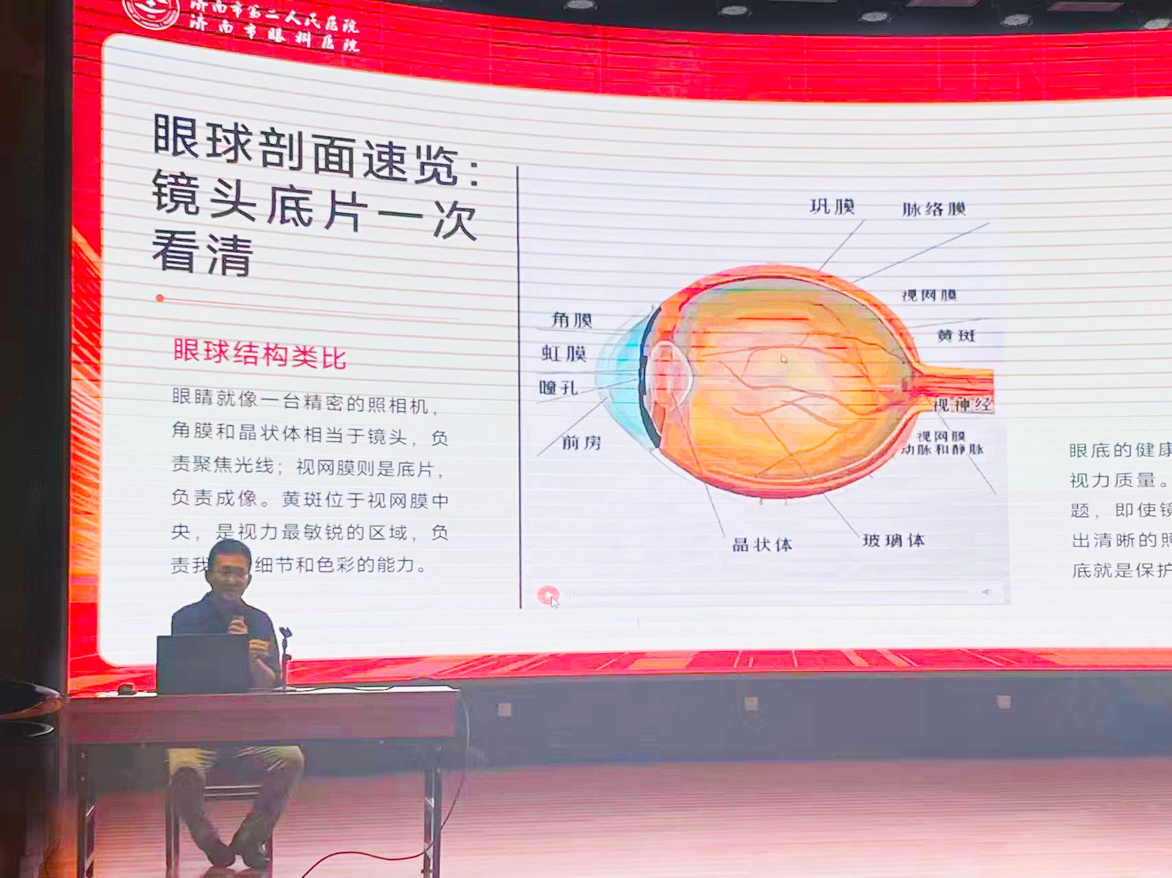 市眼科医院(市二院)眼八科(眼内科)副主任医师黄超以《守护心灵之窗——眼底病防治攻略》为题,为在场100余位老年学员带来实用眼健康知识。讲座重点讲解了老年人常见的眼底疾病,包括飞蚊症、糖尿病视网膜病变、黄斑变性等。黄医师特别强调,若出现“飞蚊”突然增多、闪光感或视野缺损等症状,需立即就医。针对糖尿病患者,黄医生指出严格控制血糖、血压和血脂是预防眼底病变的关键。他现场演示了使用Amsler方格表等自查黄斑病变的方法,并建议老年人定期进行眼底检查,建立眼健康档案。整场讲座图文并茂,语言通俗易懂,案例贴近生活,现场互动积极,学习氛围浓厚。