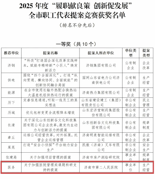 为充分发挥企事业单位民主管理制度的积极作用,引导职工代表献计献策,济南市厂务公开民主管理协调小组办公室开展了2025年“履职献良策创新促发展”全市职工代表提案竞赛活动。由济南市医务工会选送,云顶赌场