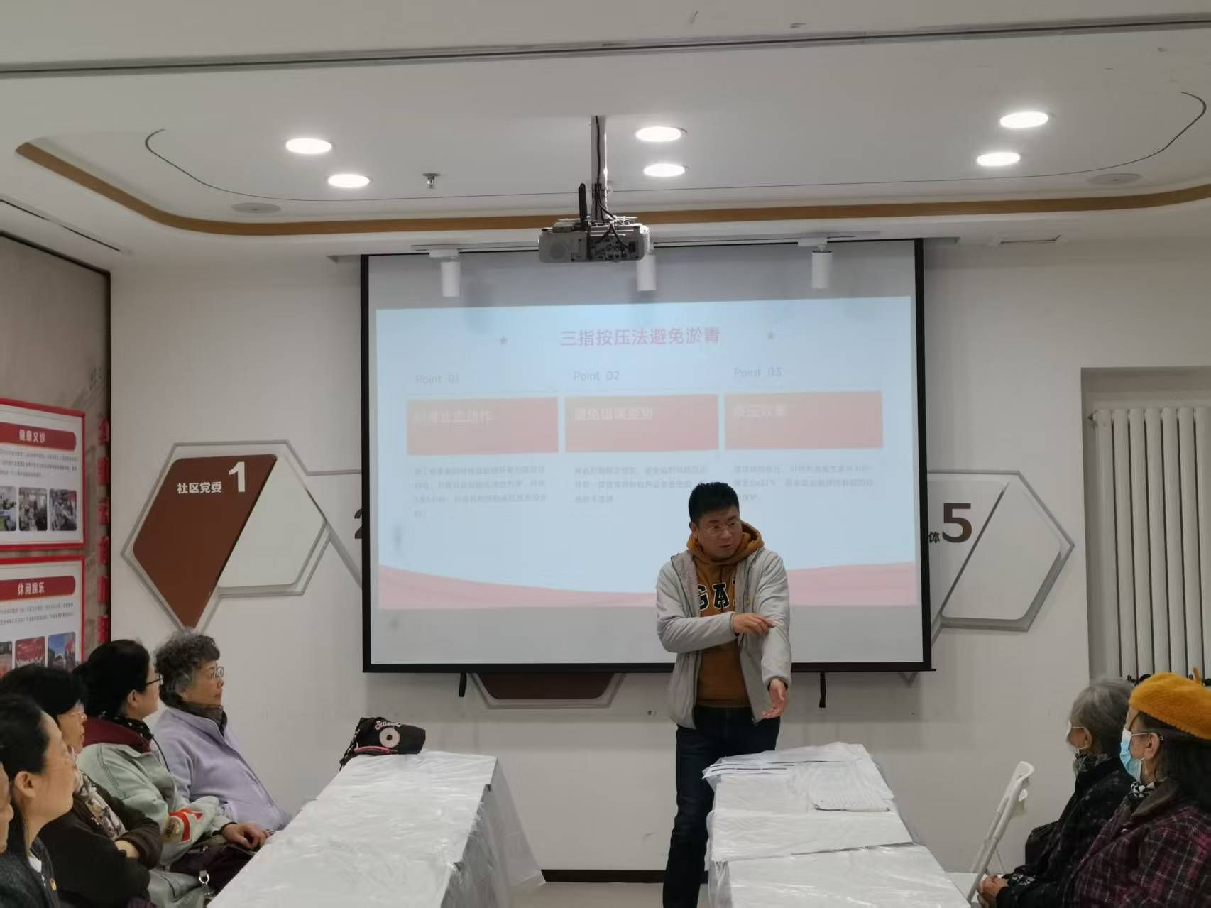 讲座中,来自医院检验科的党员高照为居民们系统讲解了采血前后的重要注意事项。他从空腹要求与饮食禁忌讲起,详细说明了采血前的准备工作;在止血按压技巧环节,他现场示范了正确的按压方法,帮助避免皮下淤血;同时还讲解了药物影响、特殊人群注意事项、针眼护理以及采血后的休息观察等重点内容。整个讲解过程条理清晰,实用性强,将专业的医学知识转化为居民易于理解的生活常识。