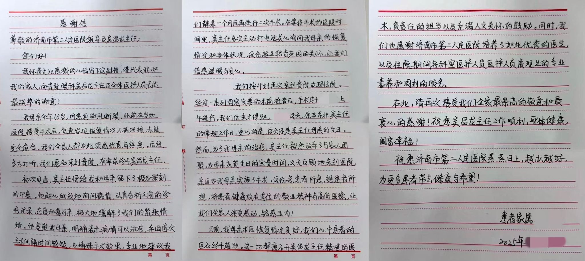 手术当天,吴昌龙教授提前抵达科室,与团队再次核对手术细节,顺利为患者完成黄斑孔修复手术。术后1周复查,原本存在的黄斑裂孔已经完全愈合,视力比前期得到了改善。家属紧握着吴教授的手,反复说着“谢谢”。连阿姨也将那面锦旗送到科室,并送上手写感谢信,字里行间满是感激。