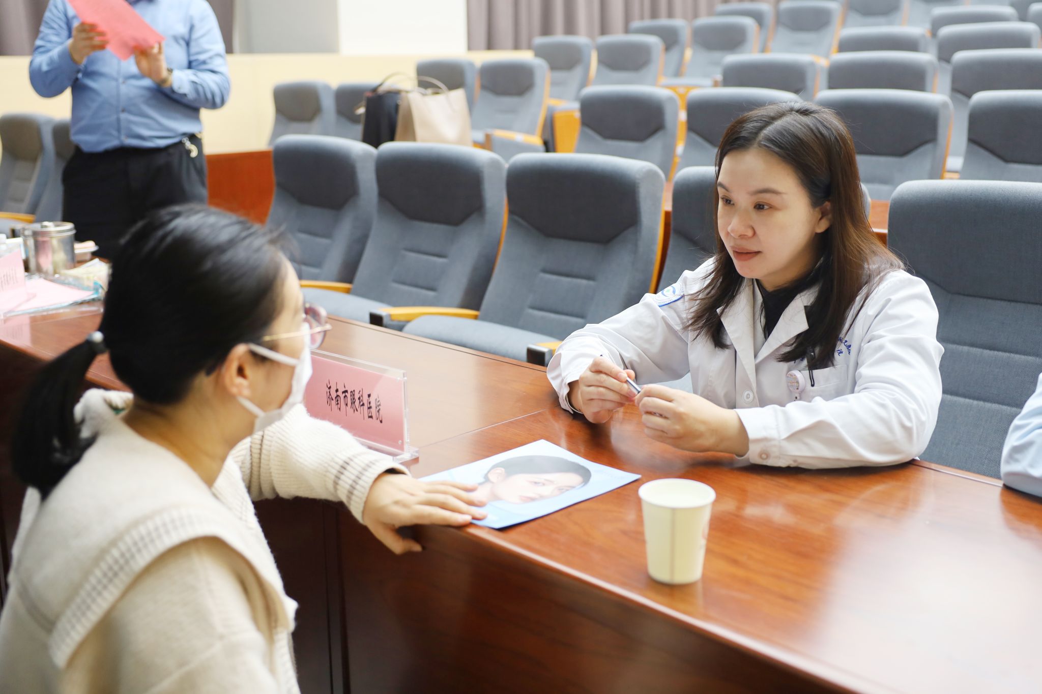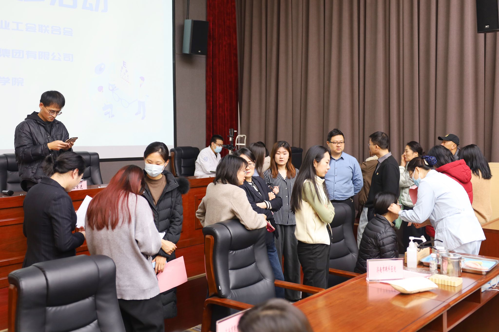 在眼科咨询区域由眼一科(眼外伤、泪器病、眼整形、眼眶病专业)副主任医师张欣为爱美的职工提供了眼整形美容相关项目咨询,并针对每个人需求给出个性化变美指导。