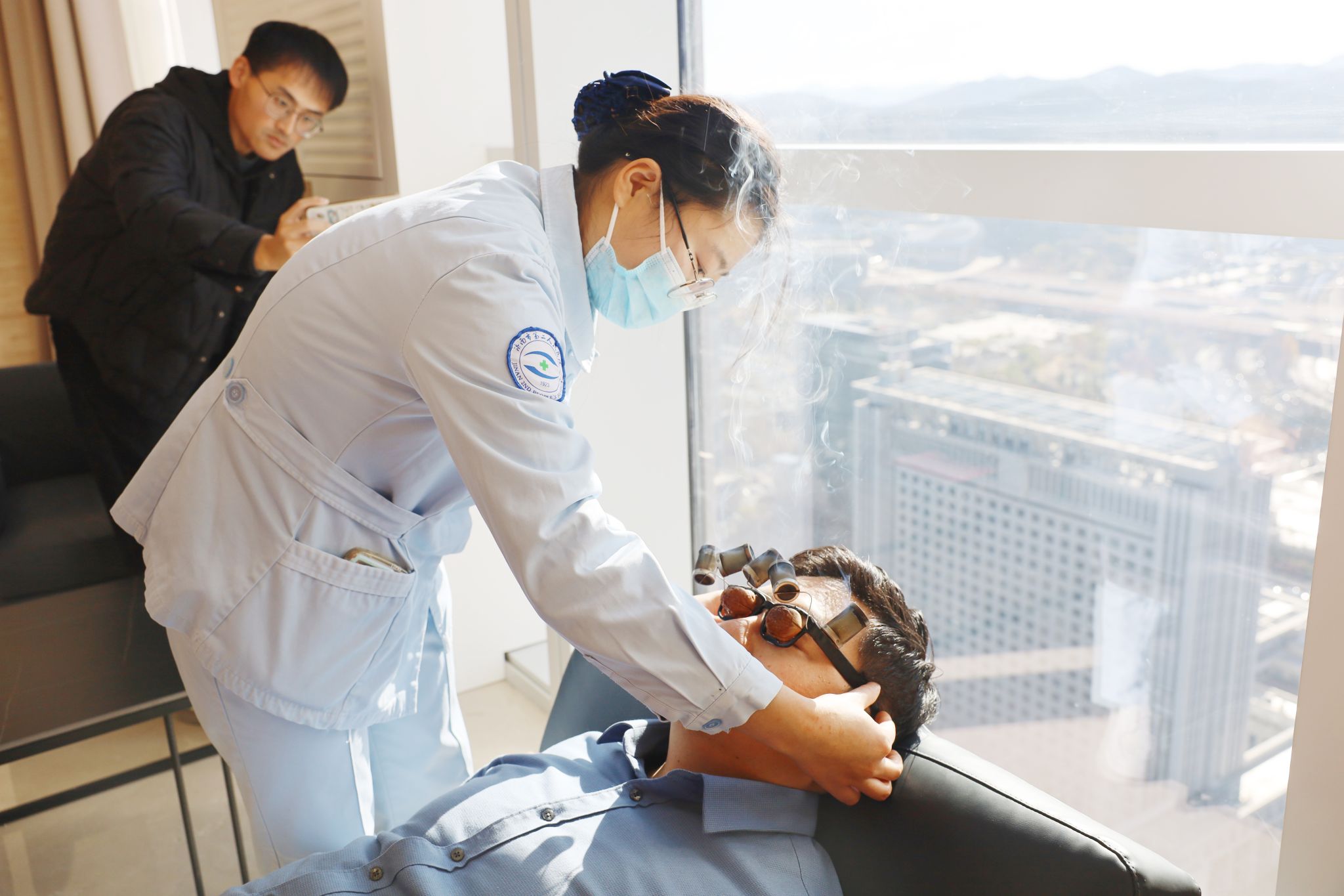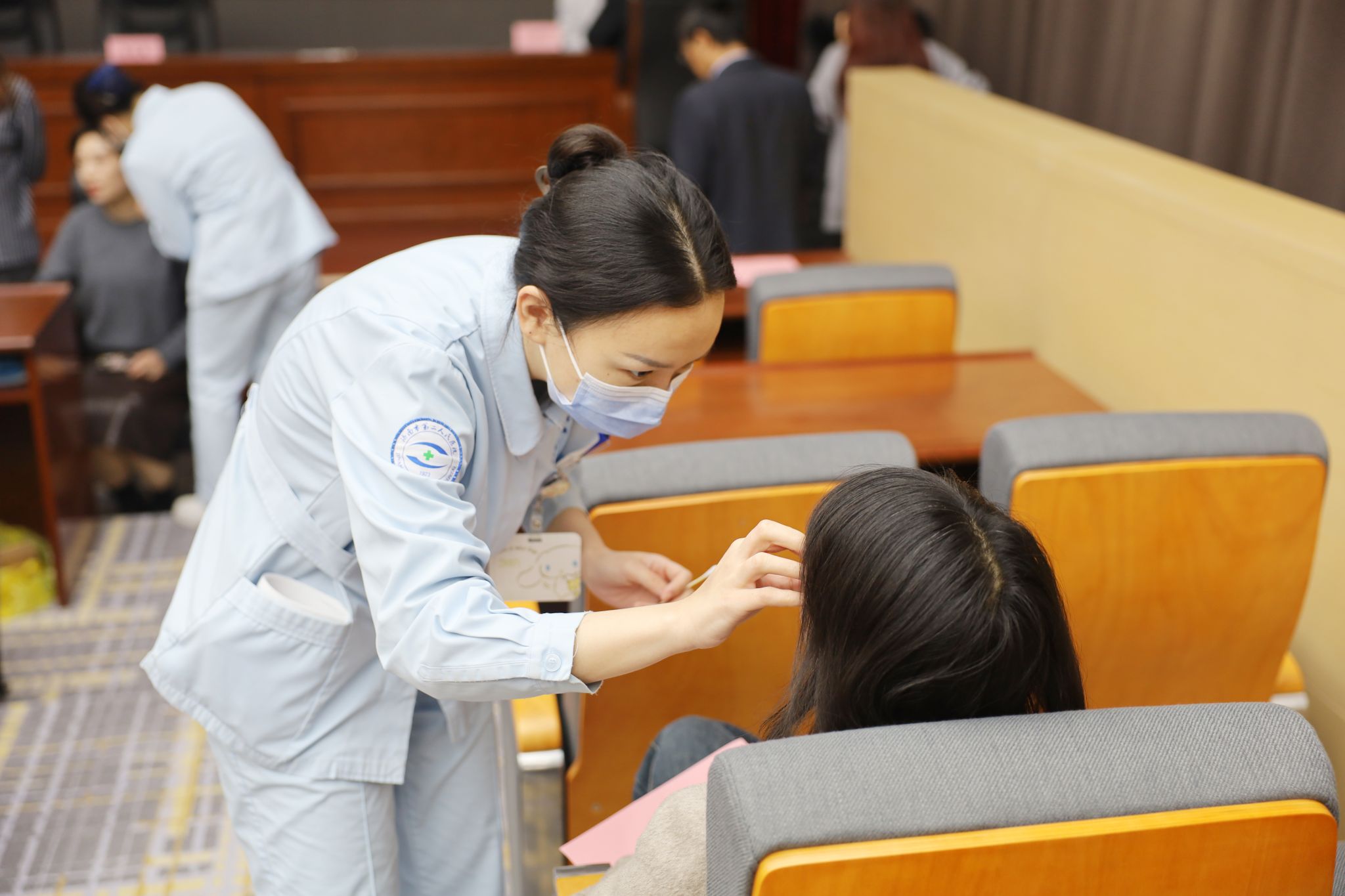 在中医体验区域,中医眼科主任宿艳通过核桃灸、耳穴压豆、号脉等传统疗法,为职工提供中医保健指导。“耳穴压豆是通过刺激耳部穴位缓解视疲劳,核桃灸则是温通眼部经络来改善眼部循环,从而缓解眼干、视物模糊等症状。”宿艳主任一边操作一边向职工解释。活动现场,不少职工体验后称酸胀感明显减轻,吸引了众多职工前来参与。