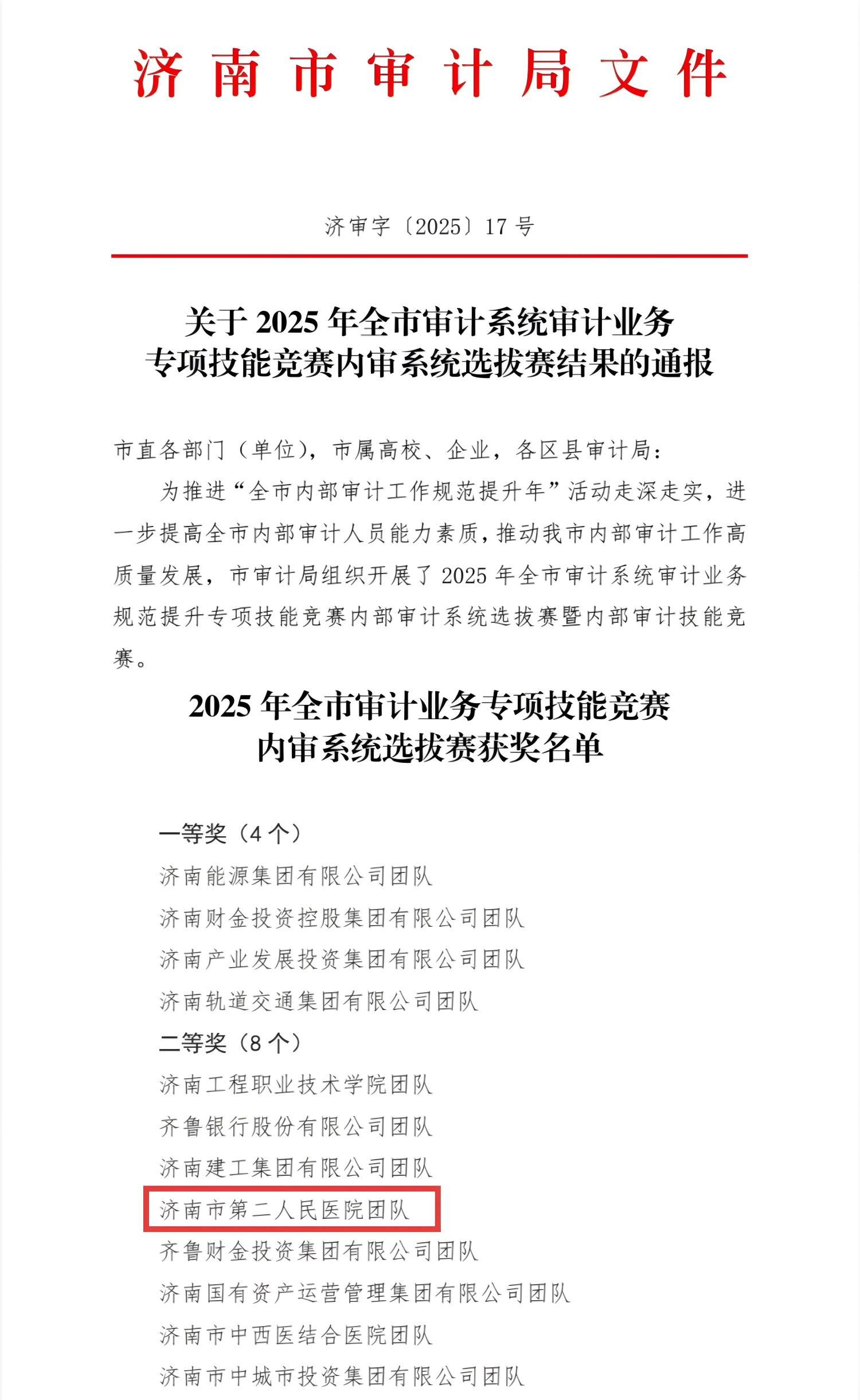 此次获奖是上级审计部门对医院审计工作的充分肯定,更是对审计团队专业能力的有力检验。市眼科医院(市二院)将以此次竞赛为新起点,持续锤炼业务本领、强化规范意识,深化审计监督与服务职能,以更务实的作风、更专业的能力推进各项审计工作,为医院规范管理、防范风险、高质量发展提供坚实的审计保障。
