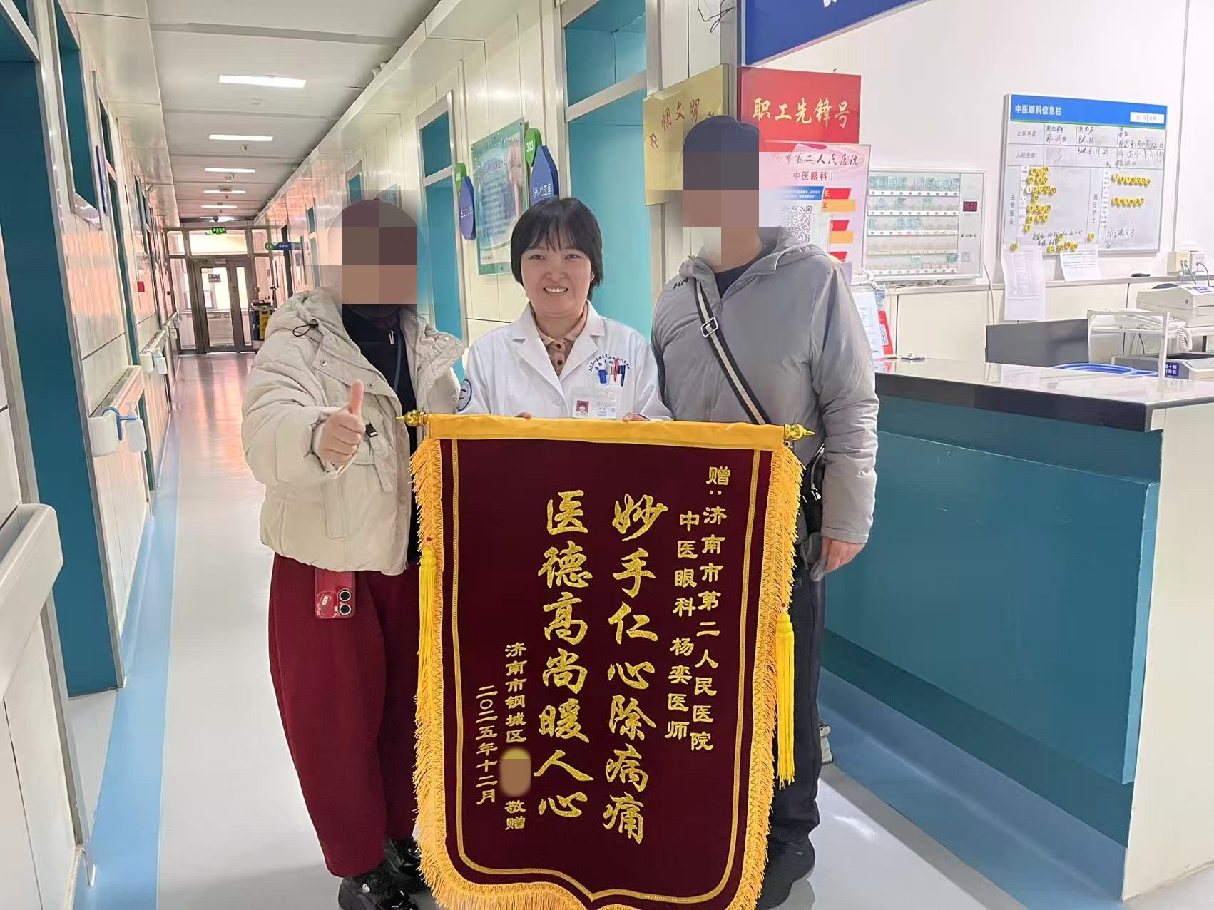 )收到了一面写着“妙手仁心除病痛,医德高尚暖人心”的锦旗。58岁的尹大爷和老伴满是感激的将锦旗送到眼十科(中医眼科)诊室主治医师杨奕医师的手上。