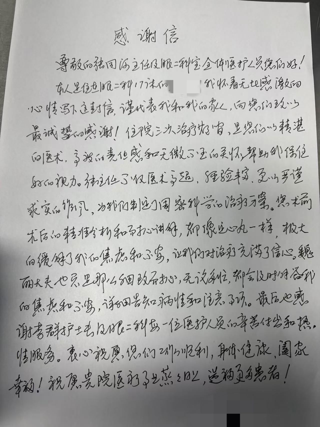 出院当日,王女士亲手写下感谢信,字里行间满是真挚的敬意。面对患者的赞誉,张同河主任表示:“患者的信任是我们前行的最大动力,守护每一位患者的光明,是我们义不容辞的责任。同时也感谢王女士信任我们云顶赌场app