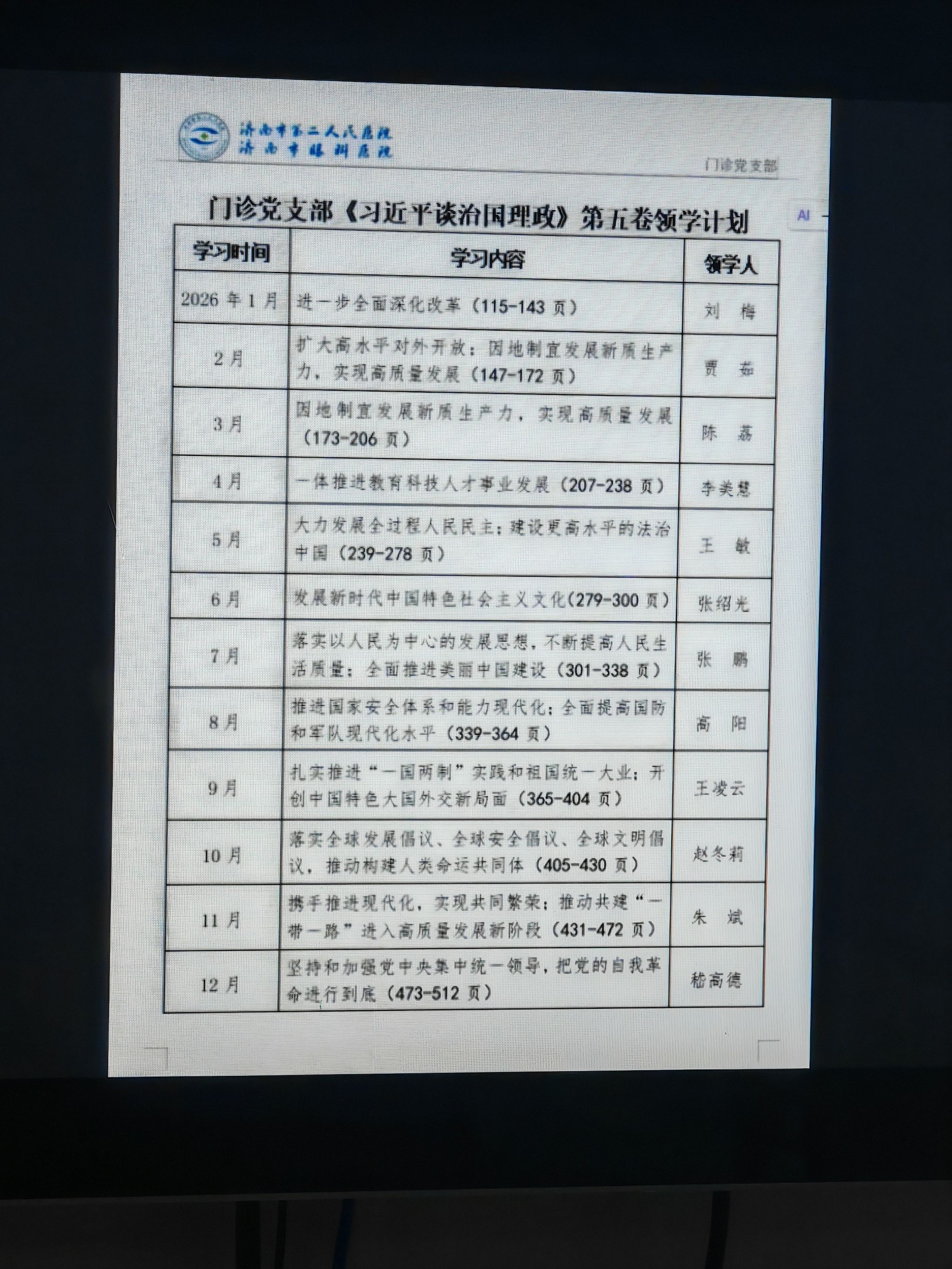 《习近平谈治国理政》第五卷是习近平新时代中国特色社会主义思想的重要组成部分,是指导实践、推动工作的行动指南。根据学习计划,2026年1月至12月,门诊党支部将每月组织一次专题学习,全年共安排12期。学习内容涵盖《习近平谈治国理政》第五卷的核心要义,包括全面深化改革、高质量发展、法治建设、文化强国、民生保障、国家安全、党的建设等内容。每期学习由一名党员担任领学人,结合原文内容和岗位实际,带领全体党员读原著、学原文、悟原理,通过系统学习,进一步加强党员的理论武装,提升政治站位,推动理论学习与医疗服务、作风建设等实际工作紧密结合,确保理论学习系统深入、学以致用,切实把学习成果转化为推动门诊高质量发展的强大动力。