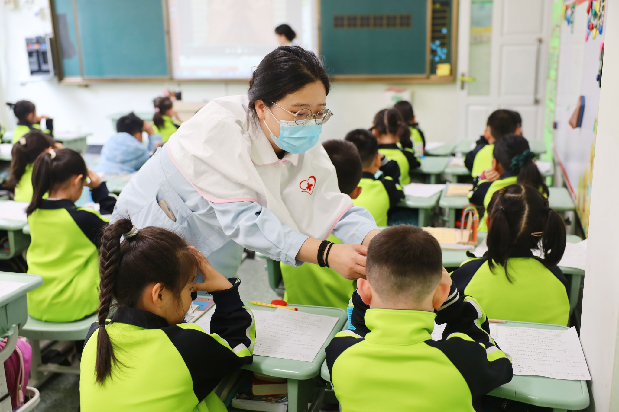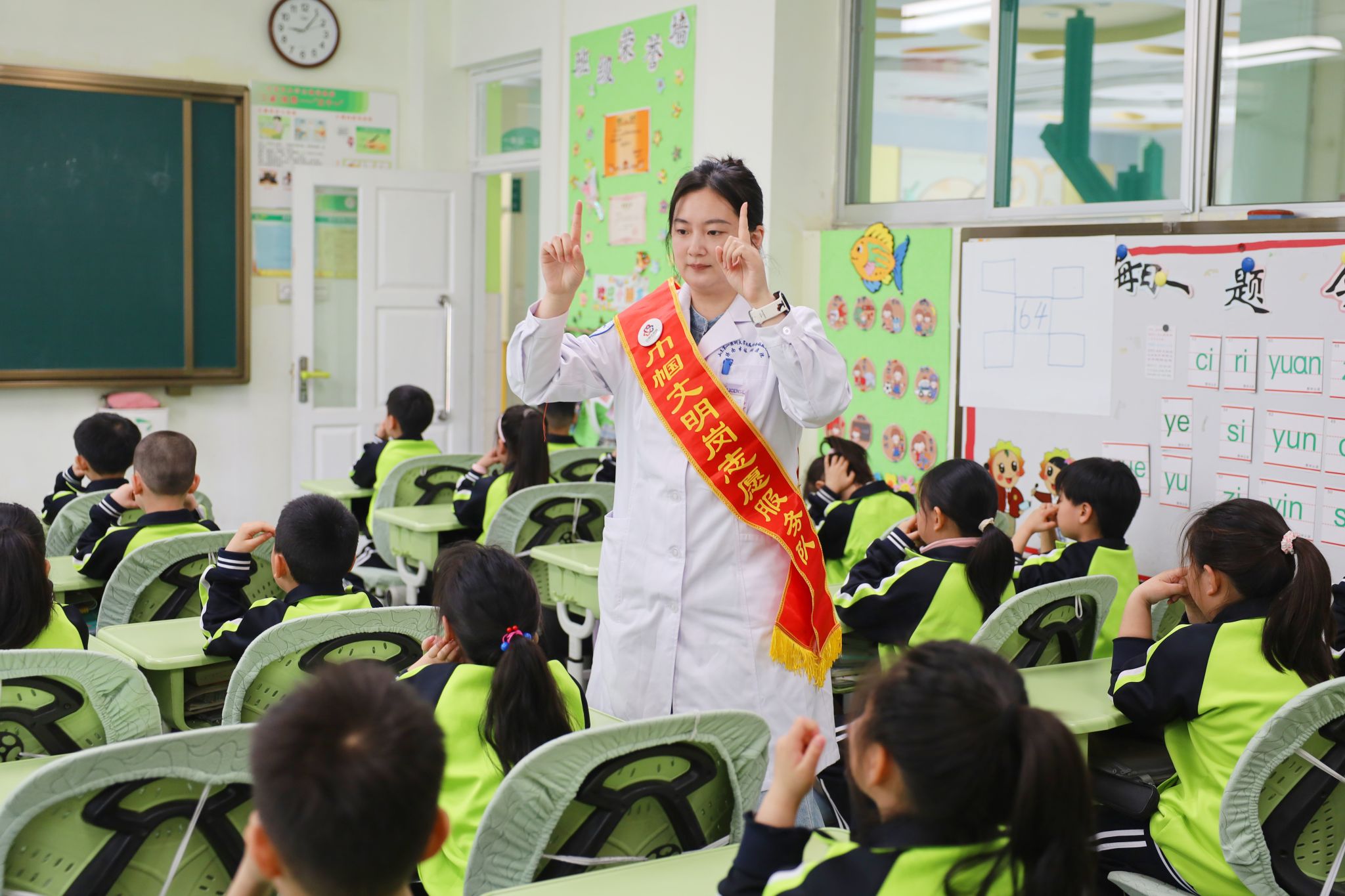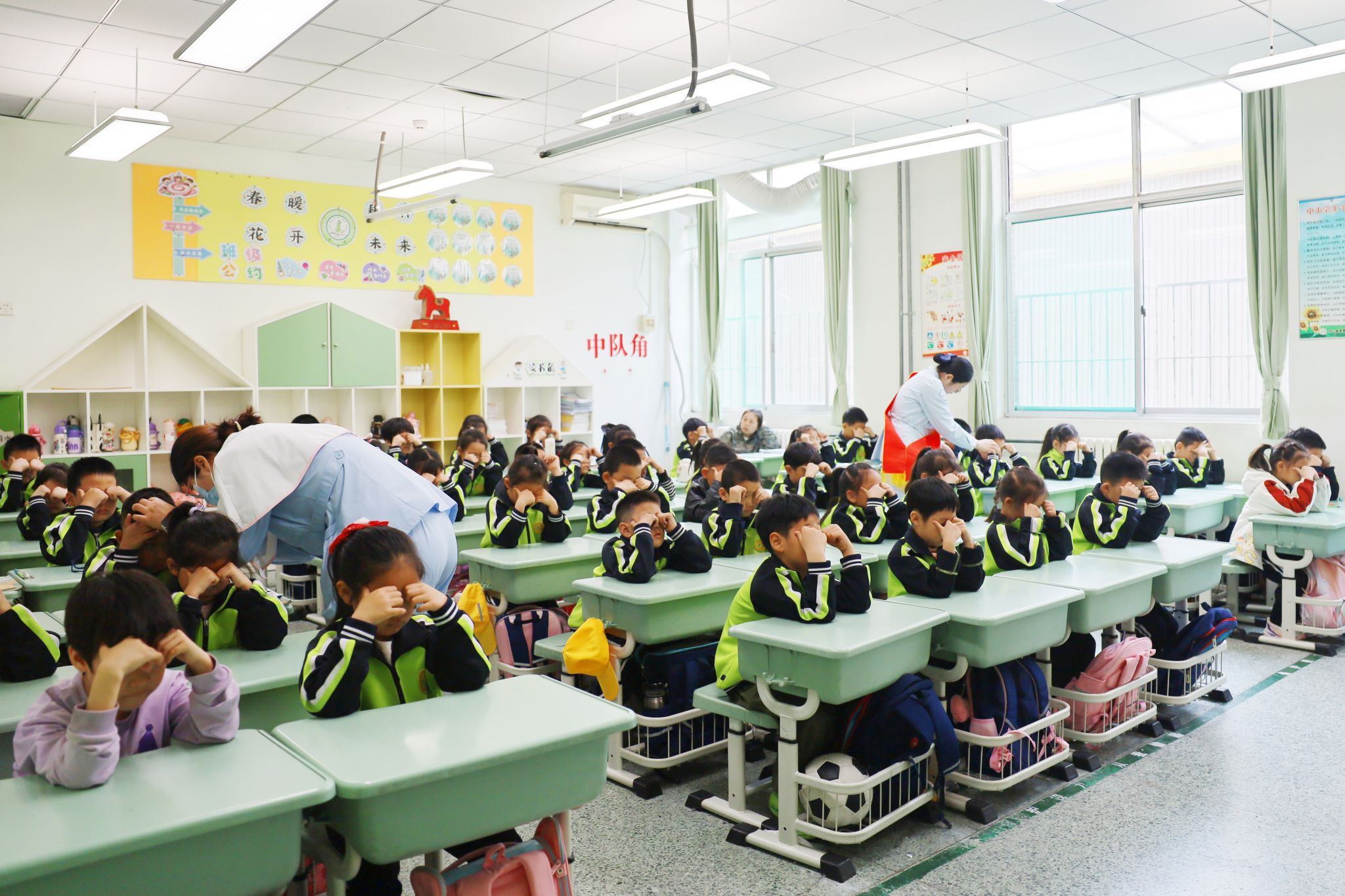 吴医生讲解结束后,主管护师高聪聪紧接着进行了干眼操的讲解与展示。她通过生动的演示,向学生们介绍了干眼症的成因及预防知识,并手把手地教授了一套简单易学的干眼操。这套操通过特定的眼部按摩手法,能够有效促进泪液分泌和眼表血液循环,对于长时间用眼后出现的眼睛干涩、疲劳等症状有很好的缓解作用。讲座结束后,五名医护人员进班开展眼保健操的“一对一”指导。她们耐心地纠正同学们的不规范的手势和力度,确保孩子们能够真正掌握正确的护眼方法,有效缓解眼部疲劳。