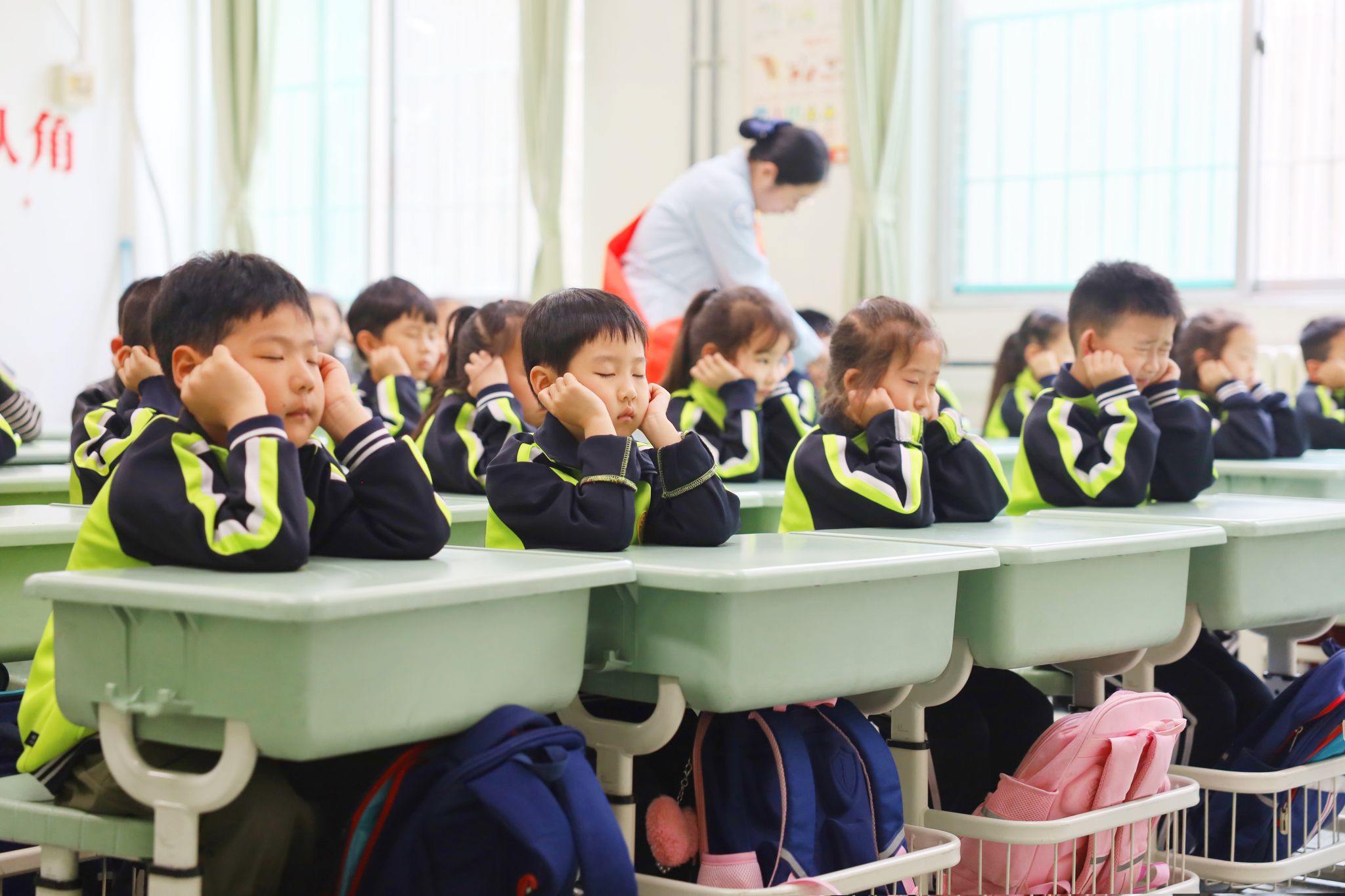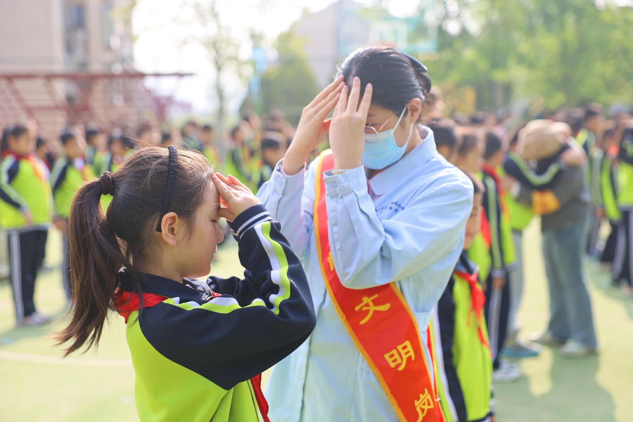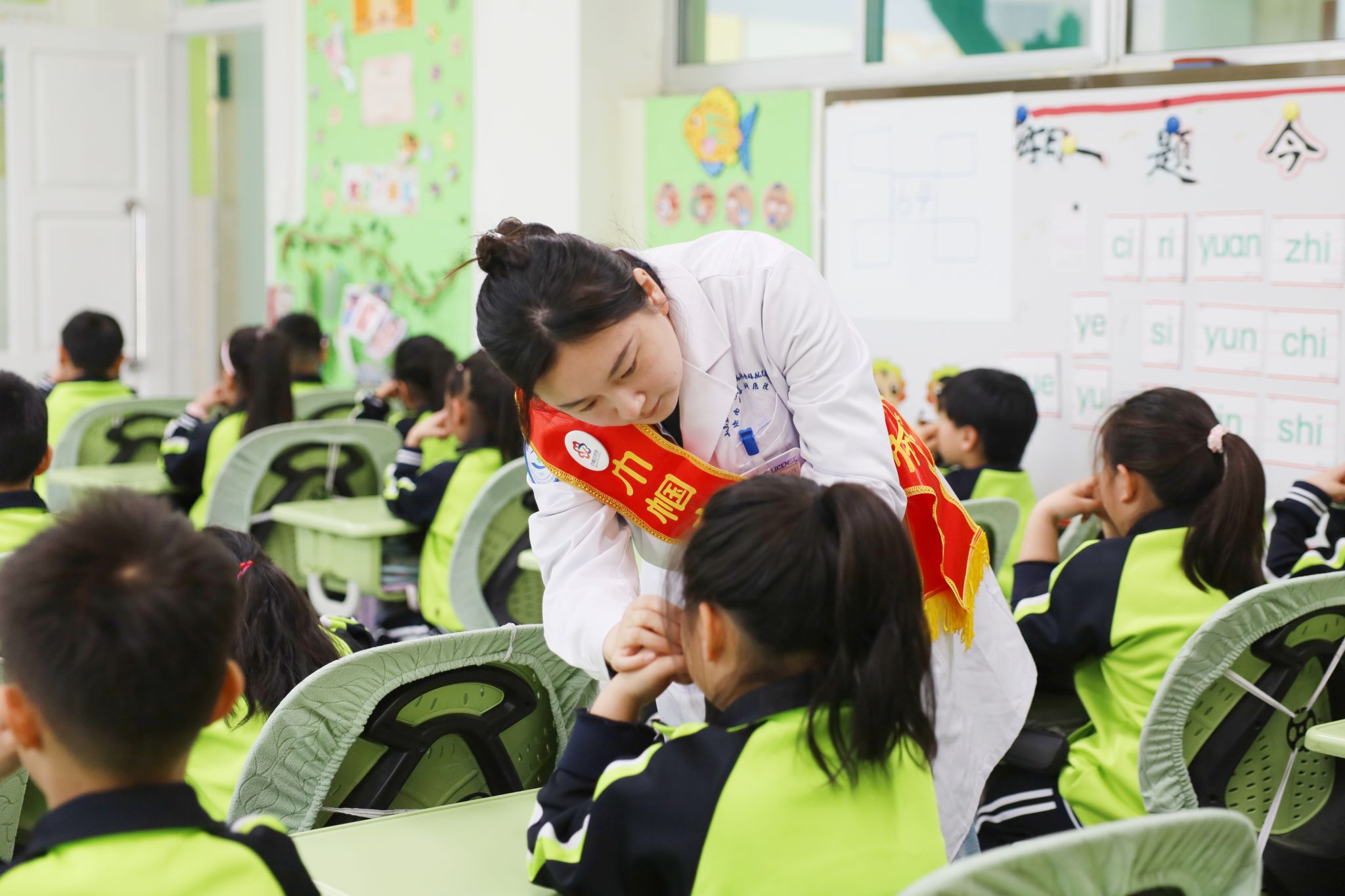吴医生讲解结束后,主管护师高聪聪紧接着进行了干眼操的讲解与展示。她通过生动的演示,向学生们介绍了干眼症的成因及预防知识,并手把手地教授了一套简单易学的干眼操。这套操通过特定的眼部按摩手法,能够有效促进泪液分泌和眼表血液循环,对于长时间用眼后出现的眼睛干涩、疲劳等症状有很好的缓解作用。讲座结束后,五名医护人员进班开展眼保健操的“一对一”指导。她们耐心地纠正同学们的不规范的手势和力度,确保孩子们能够真正掌握正确的护眼方法,有效缓解眼部疲劳。