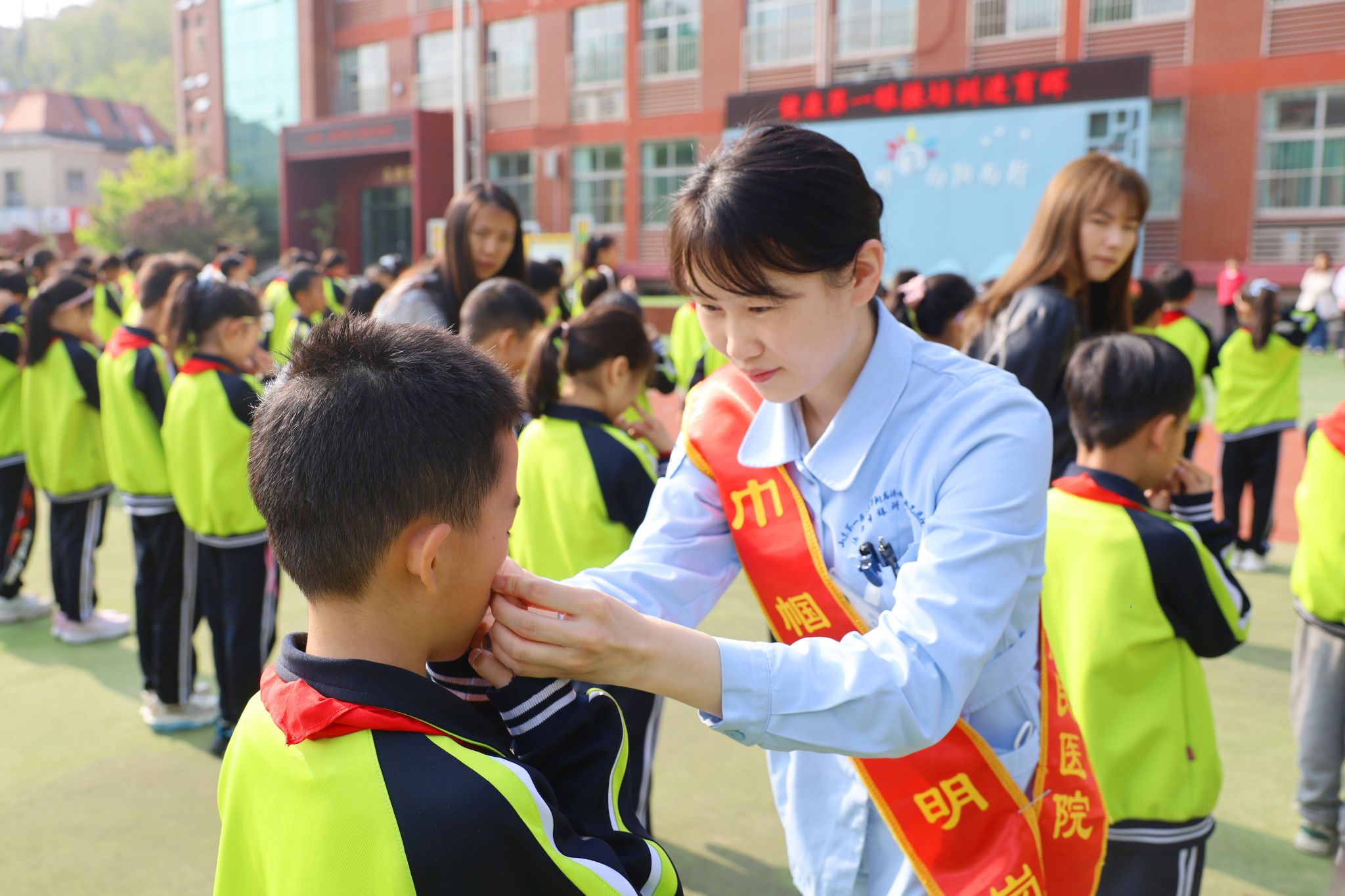 活动当天,全校学生齐聚操场,共同参与了这场户外眼健康科普培训。医院眼十科(中医眼科)主治医师吴婷婷首先为全校学生讲授了近视防控及眼保健操知识。她用通俗易懂的语言,详细拆解了眼保健操的每一个步骤,重点讲解了关键穴位的准确位置及按摩手法,让在场的每一位学生都能清晰地了解如何正确进行穴位按摩。