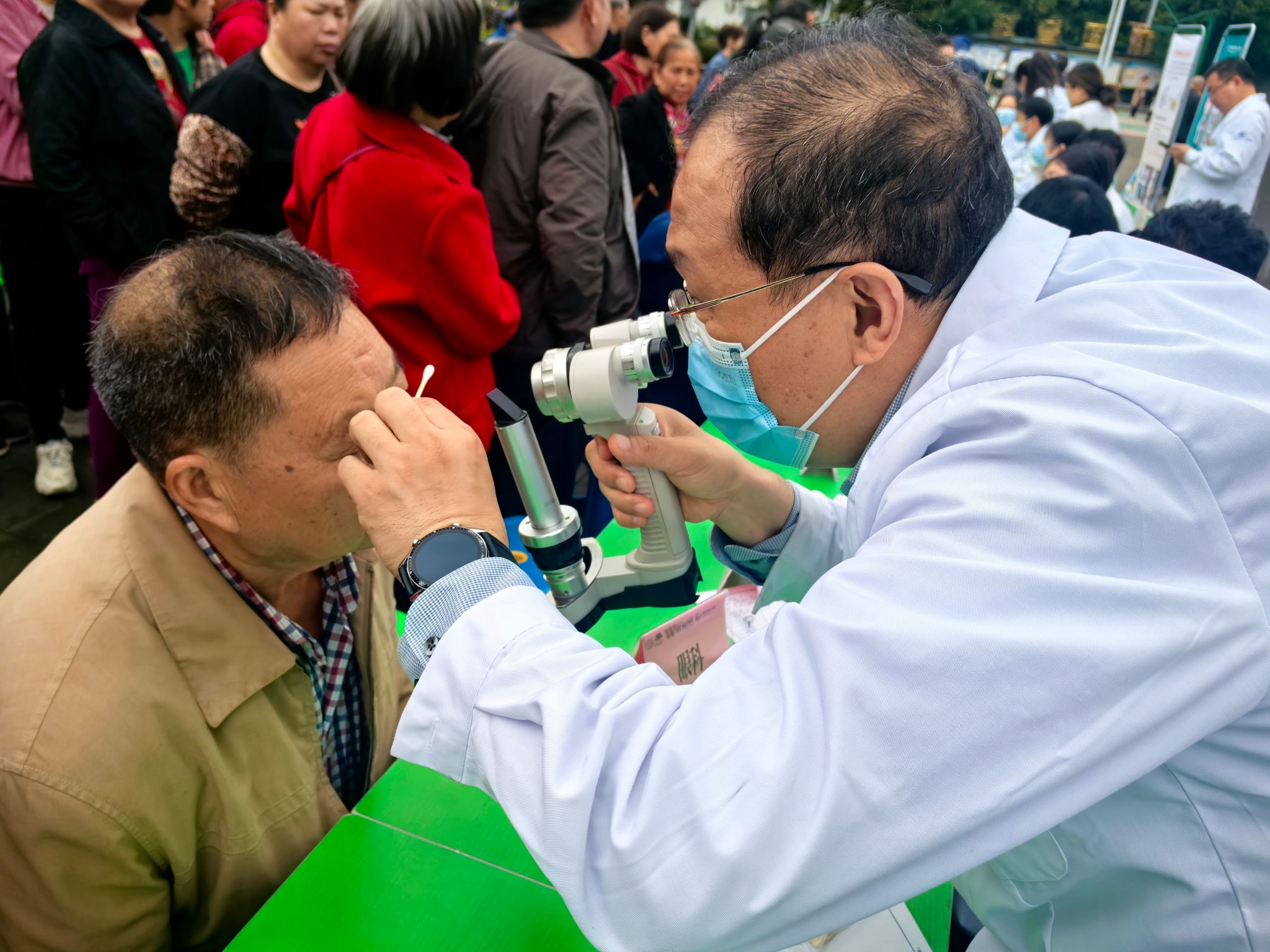 义诊开始后,韩旭光主任耐心细致地为每一位群众检查眼睛,不放过任何一个细微的症状。由于当地老年人大多讲方言,沟通上偶尔需要反复确认,韩主任不急不躁,一边用手势比划,一边放慢语速反复解释,直到对方听明白为止。一位检查完眼睛的村民竖起大拇指:“讲得清楚,我们听得懂,这样的专家下乡,我们打心底里欢迎。”