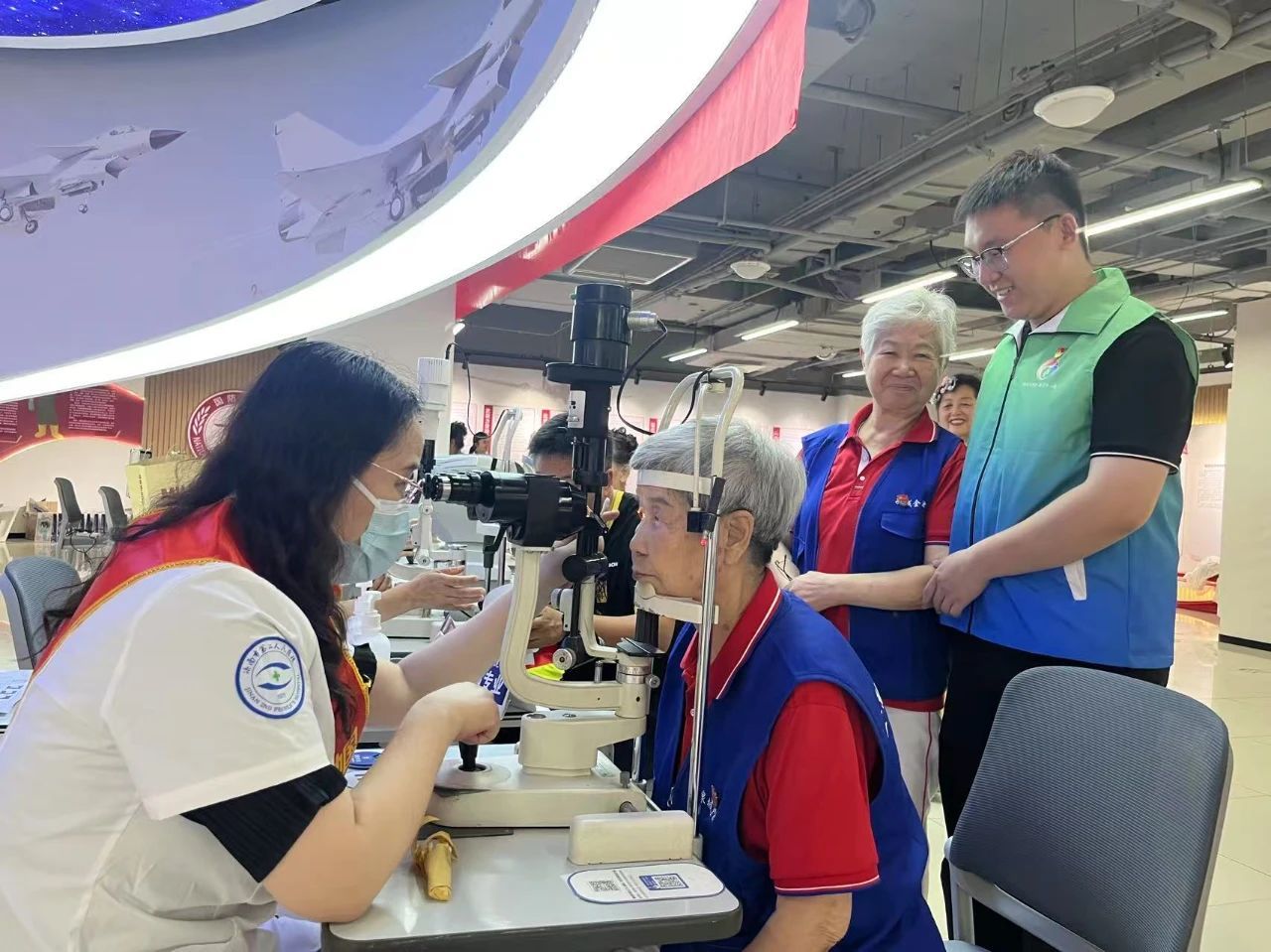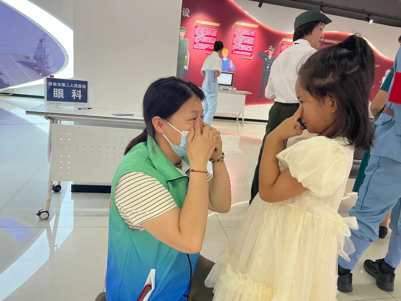 )儿童眼科门诊大厅内,党员志愿者们在活动期间一早身穿蓝绿渐变马甲,每日轮流到门诊区域开展志愿服务。他们协助导医开展秩序维护、办理就诊卡充值、指导患者就医流程、耐心解答各类疑问、引导患者有序就诊,为患者和职工送上一杯杯解暑的绿豆汤,并积极开展科普宣教活动,这一系列举措,不仅缓解了门诊医护人员的工作压力,更让患者感受到了温暖。值得一提的是,今年以来,"党员示范岗"除门诊区域外,还走出医院,走进社区、商场、公园等公共场所,开展各类公益服务,把眼保健知识传授给广大市民群众,用实际行动诠释着党员的初心与使命。