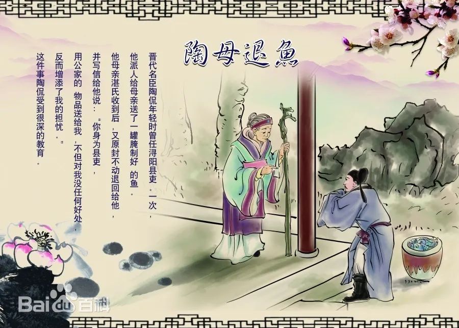 晋代名臣陶侃年轻时曾任浔阳县吏。一次,他派人给母亲送了一罐腌制好的鱼。他母亲湛氏收到后,又原封不动退回给他,并写信给他说:“你身为县吏,用公家的物品送给我不但对我没任何好处,反而增添了我的担忧。"这件事陶侃受到很深的教育。 -