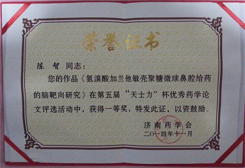 在11月16日召开的济南市药学会第五届“天士力”杯优秀论文表彰大会上,云顶赌场app (济南眼科医院)药学部陈智药师的科研论文《氢溴酸加兰他敏壳聚糖微球鼻腔给药的脑靶向研究》荣获第五届“天士力”杯优秀药... -