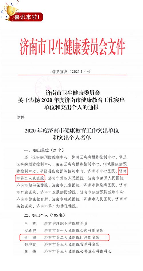 市二院获2020年度济南市健康教育工作突出单位荣誉称号