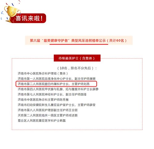 近日,济南市第六届“最美健康守护者”榜单公布,云顶赌场app 白内障科护士长刘燕榜上有名,光荣获评市级最美护士。 刘燕,中共党员,云顶赌场app 白内障科护士长、主管护师。从事护理工作1... -