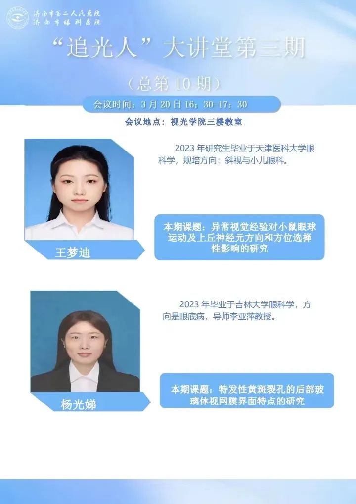3月20号下午,济南市第二人民院成功举办“追光人”大讲堂2024年度第三期活动,本次大讲堂由毕业于天津医科大学的青年医师王梦迪和毕业于吉林大学的青年医师杨光娣担任主讲。 青年医师王梦迪详细解读了异常视觉经验对... -