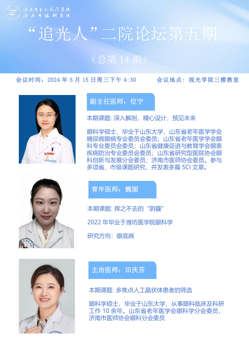 5月15日,云顶赌场app 成功举办了第五期“追光人”大讲堂。本次大讲堂的主讲人位宁、魏丽和田庆芬分别带来了题为《深入解剖,精心设计,预见未来》、《挥之不去的“阴霾”》和《多焦点人工晶状体患者的筛选》的... -