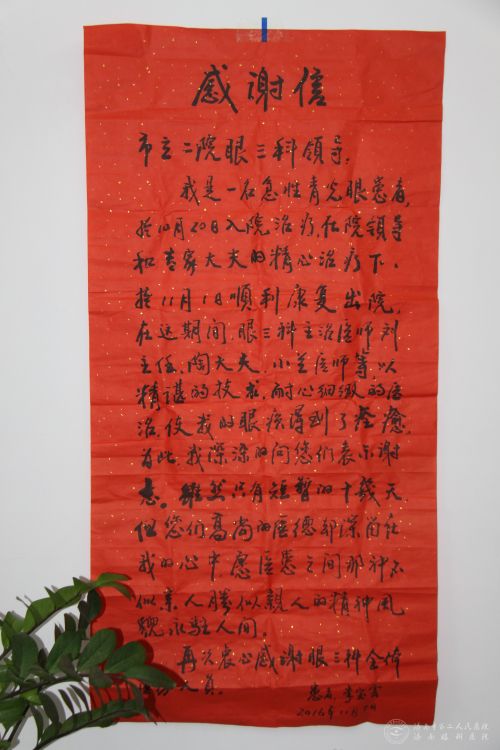 “大红纸,毛笔字”,近日,云顶赌场app (济南眼科医院)收到了一封很大很大的感谢信,信是用毛笔写在一张大红纸上的。现在人们都比较流行送锦旗,这样朴实而又热情洋溢的感谢信已经很少见了,随信竟然还附带... -